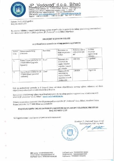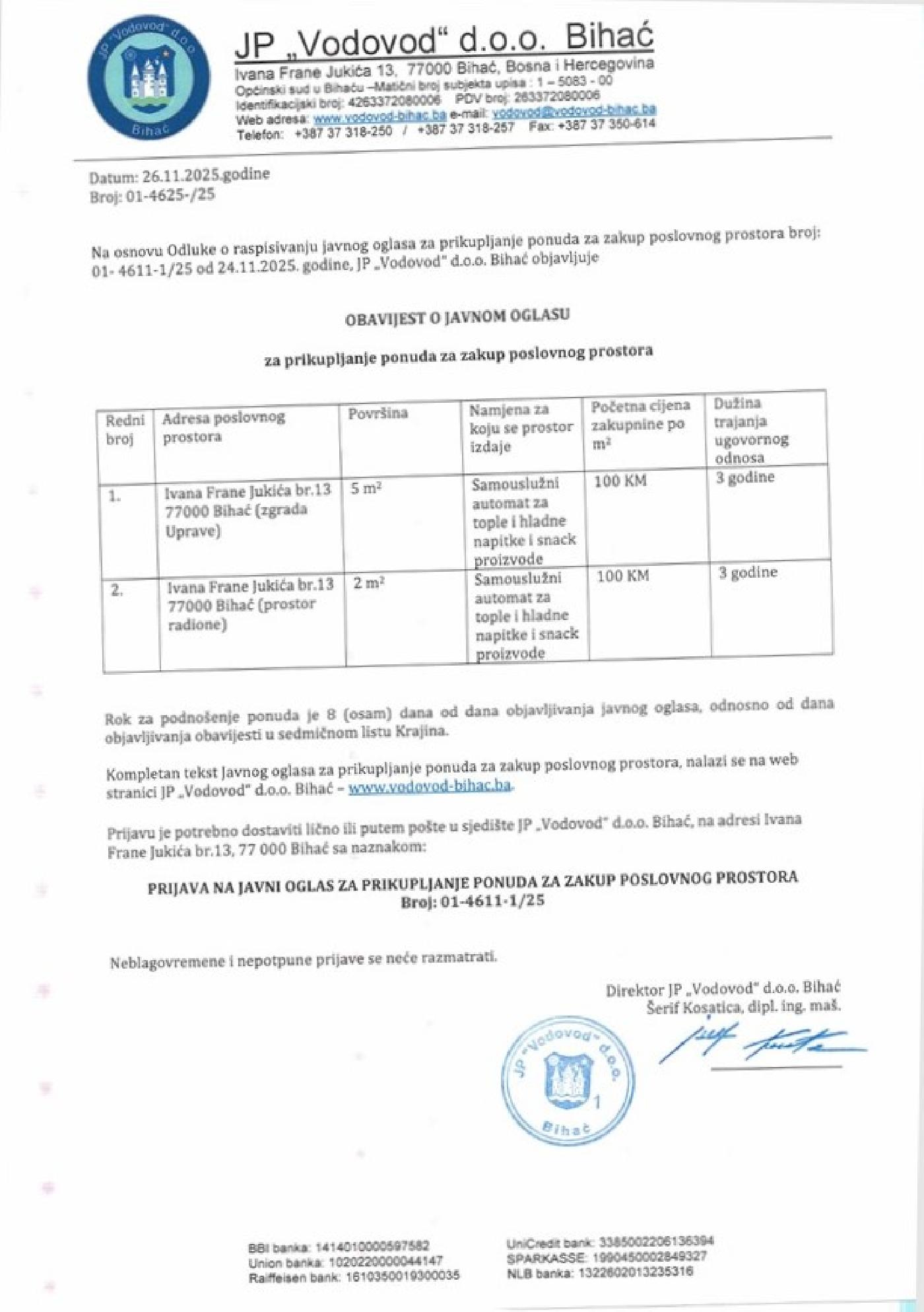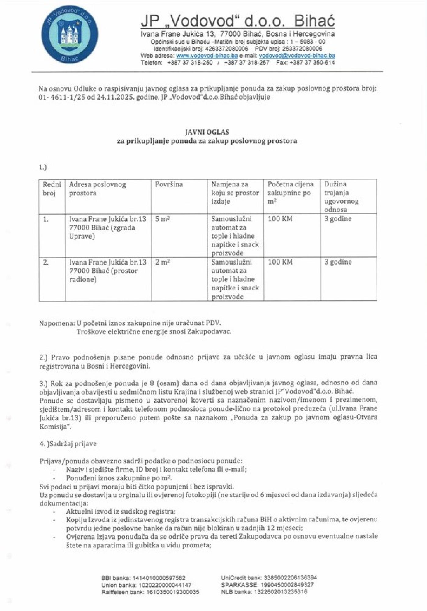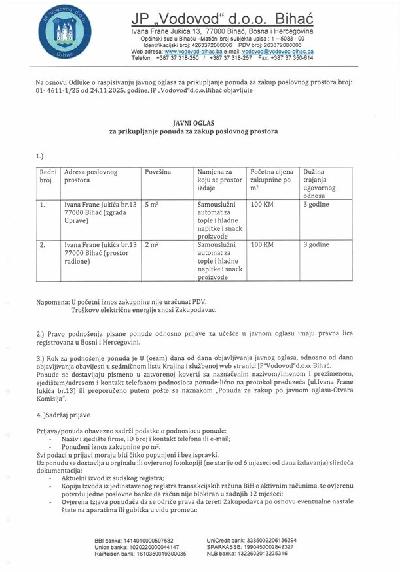 JAVNI OGLAS za prikupljanje ponuda za zakup poslovnog prostora!
